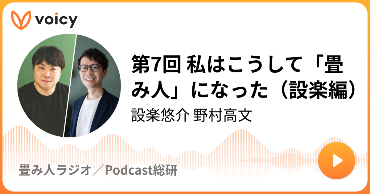 第6回 畳み人は「ただの守りの人」ではない 投稿日 2018年2月21日 更新日 2021年4月30日 著者 風呂敷 畳み人 カテゴリー Voicy 風呂敷「畳み人」ラジオ - シェア - ツイート - ブックマーク - LINE - コピー 第6回 畳み人は「ただの守りの人」ではない | 設楽悠介 野村高文「風呂敷「畳み人」ラジオ」/ Voicy – ボイスメディアビジネスにおいて、世の中の人材は2種類に分けられる。風呂敷の「広げ人」と「畳み人」だ。突飛なアイデアを次々に発信し、世間を沸かせるのが「広げ人」だとすれば、そ…voicy.jp https://voicy.jp/channel/607/14148 聞いてよ!畳み人 みんなのメンタールームCheck out this great listen on Audible.co.jp. 皆さんのお悩みご相談はこちらまで (匿名/ラジオネームも可) sodan@minnanomentor.com 「みんなのメンタールーム」は…www.audible.co.jp 風呂敷畳み人/設楽悠介・野村高文さんへのリクエスト・質問募集 – 聞いてよ!畳み人 幻冬舎設楽悠介/NewsPicks野村高文風呂敷畳み人/設楽悠介・野村高文さんにリクエスト・質問を匿名で送ることができます。ysksdr.pageful.app この記事を書いた人 風呂敷 畳み人 記事一覧 Twitter