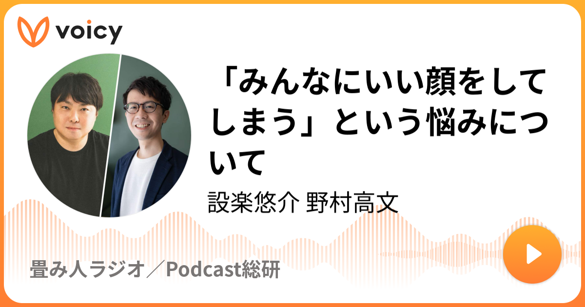 入社1年で転職ってありですか?( #畳み人 ラジオ) 投稿日 2020年12月7日 更新日 2021年4月24日 著者 風呂敷 畳み人 カテゴリー Voicy 風呂敷「畳み人」ラジオ - シェア - ツイート - ブックマーク - LINE - コピー 入社1年で転職ってありですか?( #畳み人 ラジオ) | 設楽悠介 野村高文「風呂敷「畳み人」ラジオ」/ Voicy – ボイスメディアビジネスにおいて、世の中の人材は2種類に分けられる。風呂敷の「広げ人」と「畳み人」だ。突飛なアイデアを次々に発信し、世間を沸かせるのが「広げ人」だとすれば、そ…voicy.jp https://voicy.jp/channel/607/112206 聞いてよ!畳み人 みんなのメンタールームCheck out this great listen on Audible.co.jp. 皆さんのお悩みご相談はこちらまで (匿名/ラジオネームも可) sodan@minnanomentor.com 「みんなのメンタールーム」は…www.audible.co.jp 風呂敷畳み人/設楽悠介・野村高文さんへのリクエスト・質問募集 – 聞いてよ!畳み人 幻冬舎設楽悠介/NewsPicks野村高文風呂敷畳み人/設楽悠介・野村高文さんにリクエスト・質問を匿名で送ることができます。ysksdr.pageful.app この記事を書いた人 風呂敷 畳み人 記事一覧 Twitter