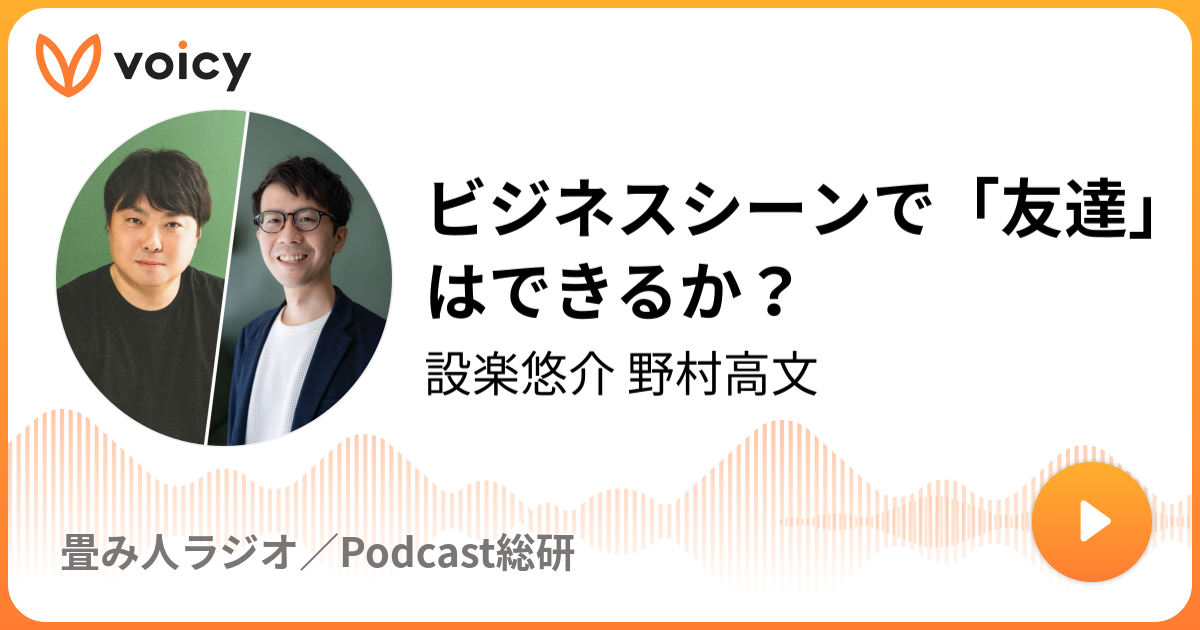 ジョブローテーション是か非か( #畳み人 ラジオ) 投稿日 2021年1月12日 更新日 2021年4月24日 著者 風呂敷 畳み人 カテゴリー Voicy 風呂敷「畳み人」ラジオ - シェア - ツイート - ブックマーク - LINE - コピー ジョブローテーション是か非か( #畳み人 ラジオ) | 設楽悠介 野村高文「風呂敷「畳み人」ラジオ」/ Voicy – ボイスメディアビジネスにおいて、世の中の人材は2種類に分けられる。風呂敷の「広げ人」と「畳み人」だ。突飛なアイデアを次々に発信し、世間を沸かせるのが「広げ人」だとすれば、そ…voicy.jp https://voicy.jp/channel/607/116728 聞いてよ!畳み人 みんなのメンタールームCheck out this great listen on Audible.co.jp. 皆さんのお悩みご相談はこちらまで (匿名/ラジオネームも可) sodan@minnanomentor.com 「みんなのメンタールーム」は…www.audible.co.jp 風呂敷畳み人/設楽悠介・野村高文さんへのリクエスト・質問募集 – 聞いてよ!畳み人 幻冬舎設楽悠介/NewsPicks野村高文風呂敷畳み人/設楽悠介・野村高文さんにリクエスト・質問を匿名で送ることができます。ysksdr.pageful.app この記事を書いた人 風呂敷 畳み人 記事一覧 Twitter